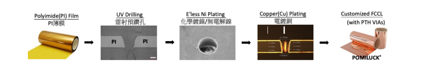 PMR採用全新工藝在PI先進行雷射鑽孔再金屬化的流程,稱之為預鑽孔技術(Pre-drilled Technology),大幅簡化FPC製造流程,提高軟板生產效率,降低生產成本,不僅能針對各種設計需求進行靈活調整,同時完成面銅與孔銅的金屬化,減少孔洞內金屬斷裂的風險,提升導通孔的信賴性,並且微小孔會直接填孔,可以取代複雜的盲孔製作。