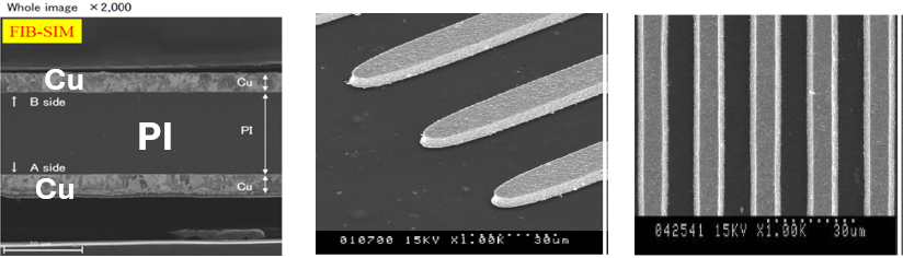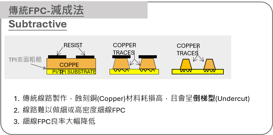搭配自有的PI金屬化技術以及SAP (Semi-Additive Process)加工技術,是製造超微細線路軟性電路板的關鍵方法,適用於超薄聚醯亞胺基材,避免傳統製程中因頻繁搬運造成的基板皺摺或污染。全程卷對卷連續式製程可減少人為接觸,自動化生產亦可確保高良率,大規模生產時單位成本顯著低於傳統製程。