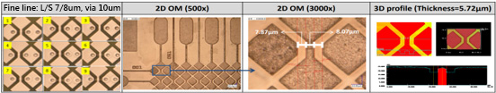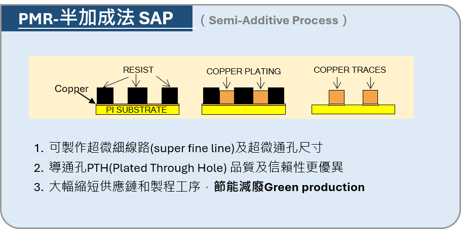 PMR的半加成製程(Semi-Additive Process, SAP)是結合加成法(Additive Process)與減成法(Subtractive Process)優點的細線路電路板製程,具有高解析度、側蝕小、線路品質穩定等優勢。相較於改良式半加成(Modified Semi-Additive Process, mSAP)是以超薄銅箔基板(銅厚通常1~3μm)為起始材料,SAP則在聚醯亞胺膜(Polyimide, PI)上先進行鑽孔(Via drilling),並以直接金屬化方式在聚醯亞胺膜(Polyimide, PI)上形成極薄的導電層。兩者能做的線寬/線距都大幅優於傳統減成法(Subtractive Process),mSAP可達20/20μm,SAP甚至可實現10/10 μm以下的極細線路。